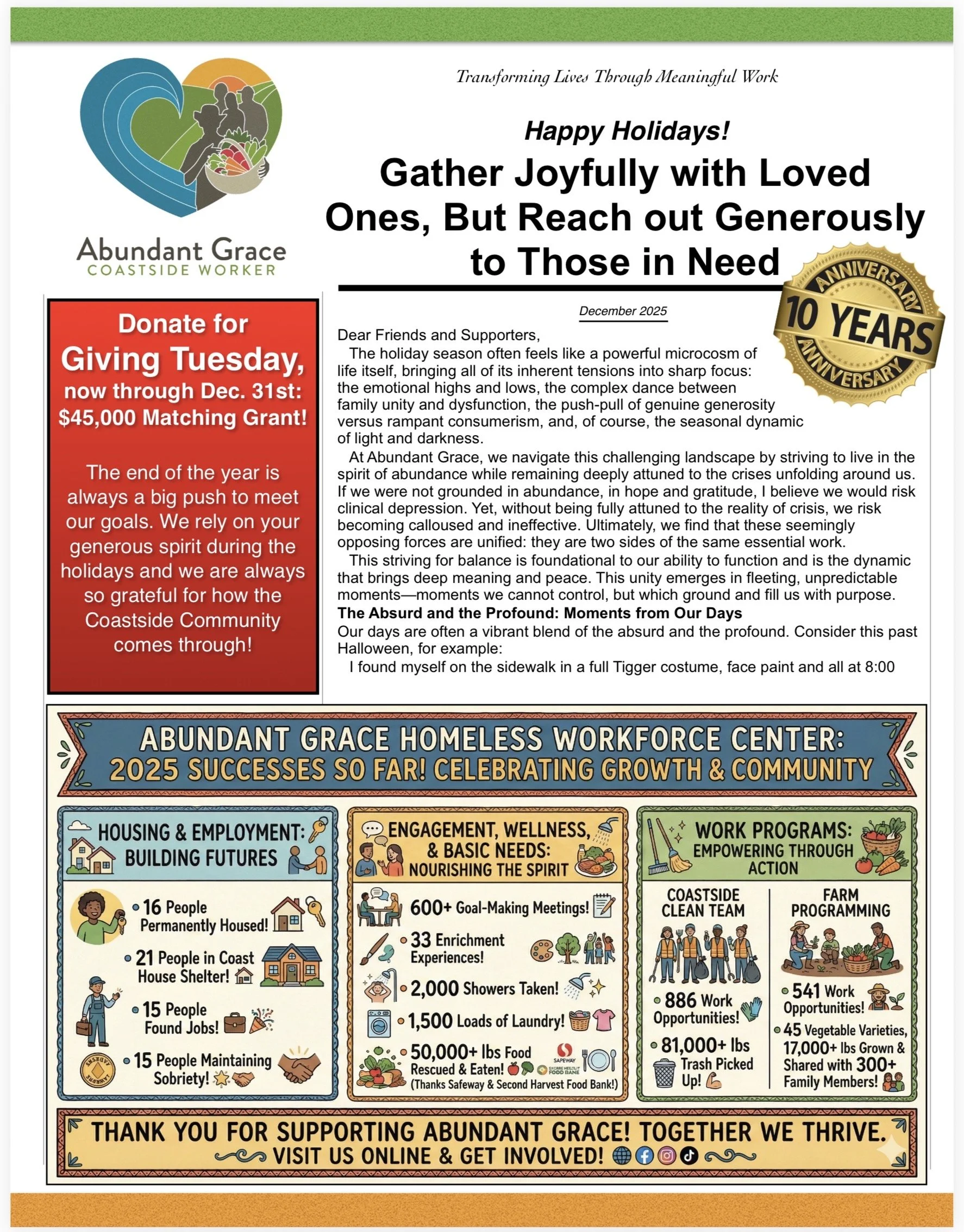 Abundant Grace transforms lives through our job-readiness programming: taking people experiencing homelessness to grow and harvest over 15,000 pounds of fresh, organic produce for free distribution to low-income families at our Full Circle Food Justice Program; and to clean up the environment on the beaches and trails of Half Moon Bay on the Coastside Clean Team. We are doing good, meaningful work together; we are making a difference in our community; we are transforming our very selves. Please be a part of this unique project. Make common cause with us. We can't do it alone - we need your participation and support.
